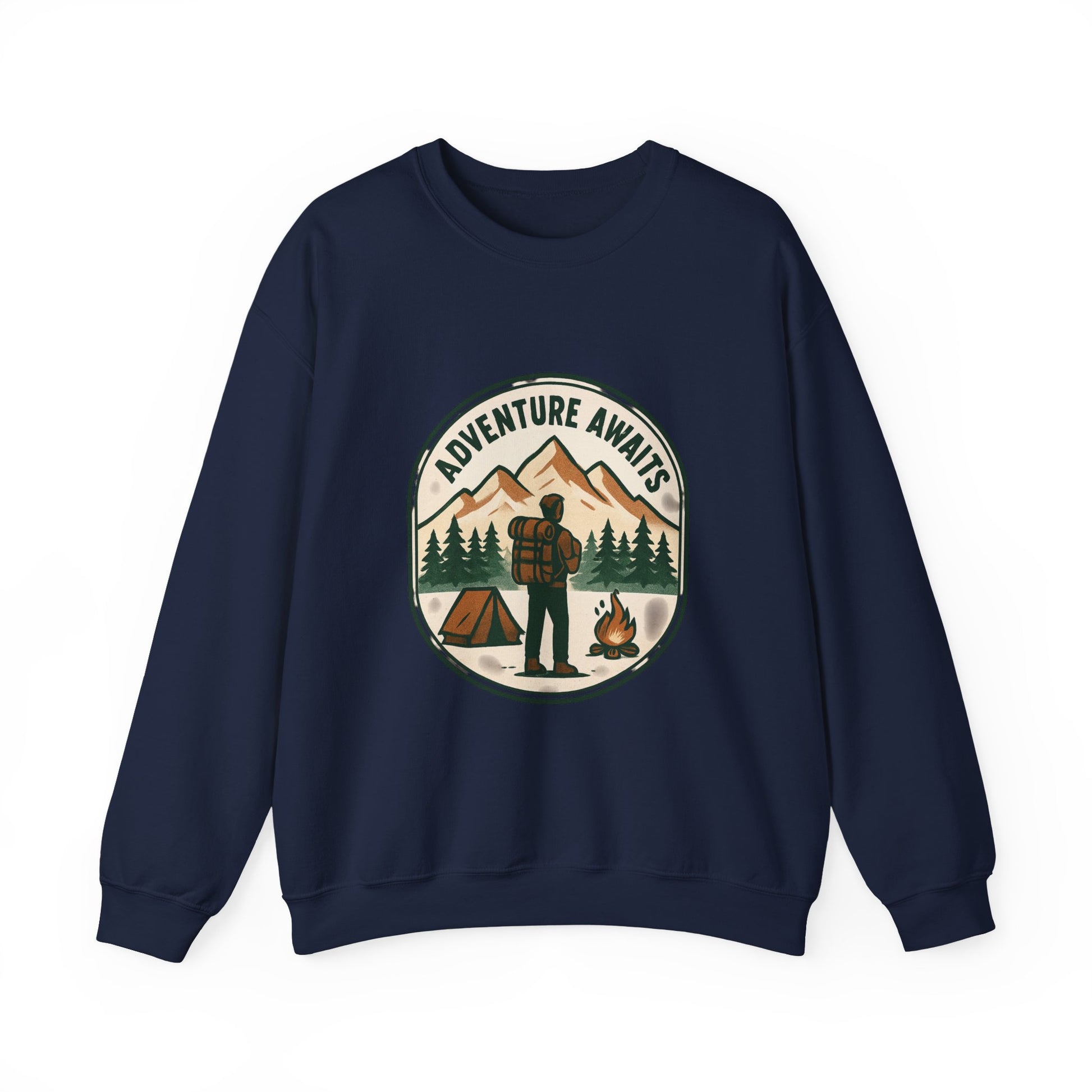 Adventure Awaits Crewneck Sweatshirt — Camping Mountain Graphic
