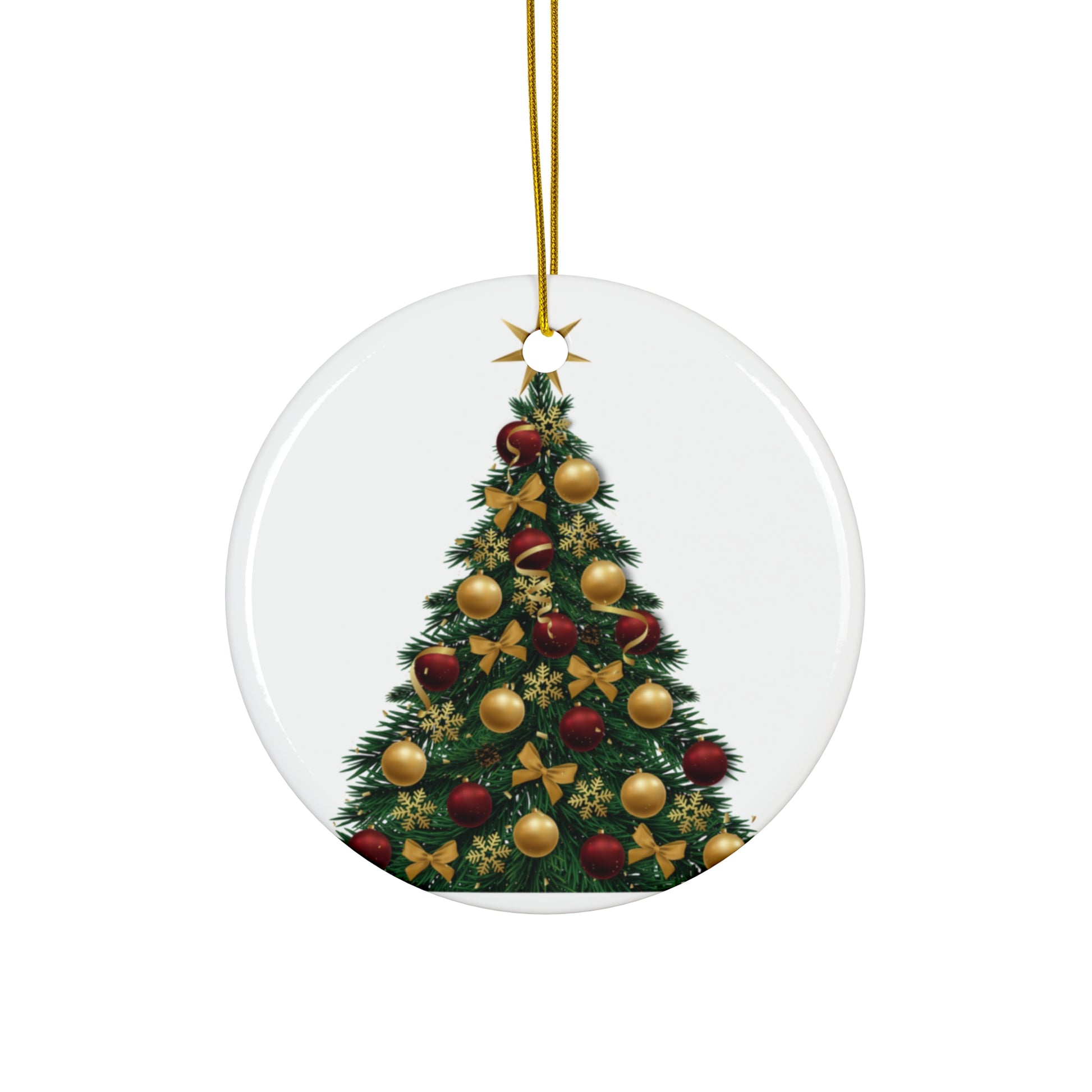 Hand-crafted ceramic ornament that brings a warm, nostalgic holiday hush to any tree or cozy corner. The glossy one-sided print shows a richly detailed Christmas tree trimmed with gold and red baubles and tiny stars — colors stay bright thanks to modern printing on thick, durable ceramic. A pre-drilled hole and gold-toned hanging string arrive ready to display. Use it to layer memories on a family tree, tuck into a special stocking, or add a finishing touch to seasonal décor that’ll catch the light and invite compliments.