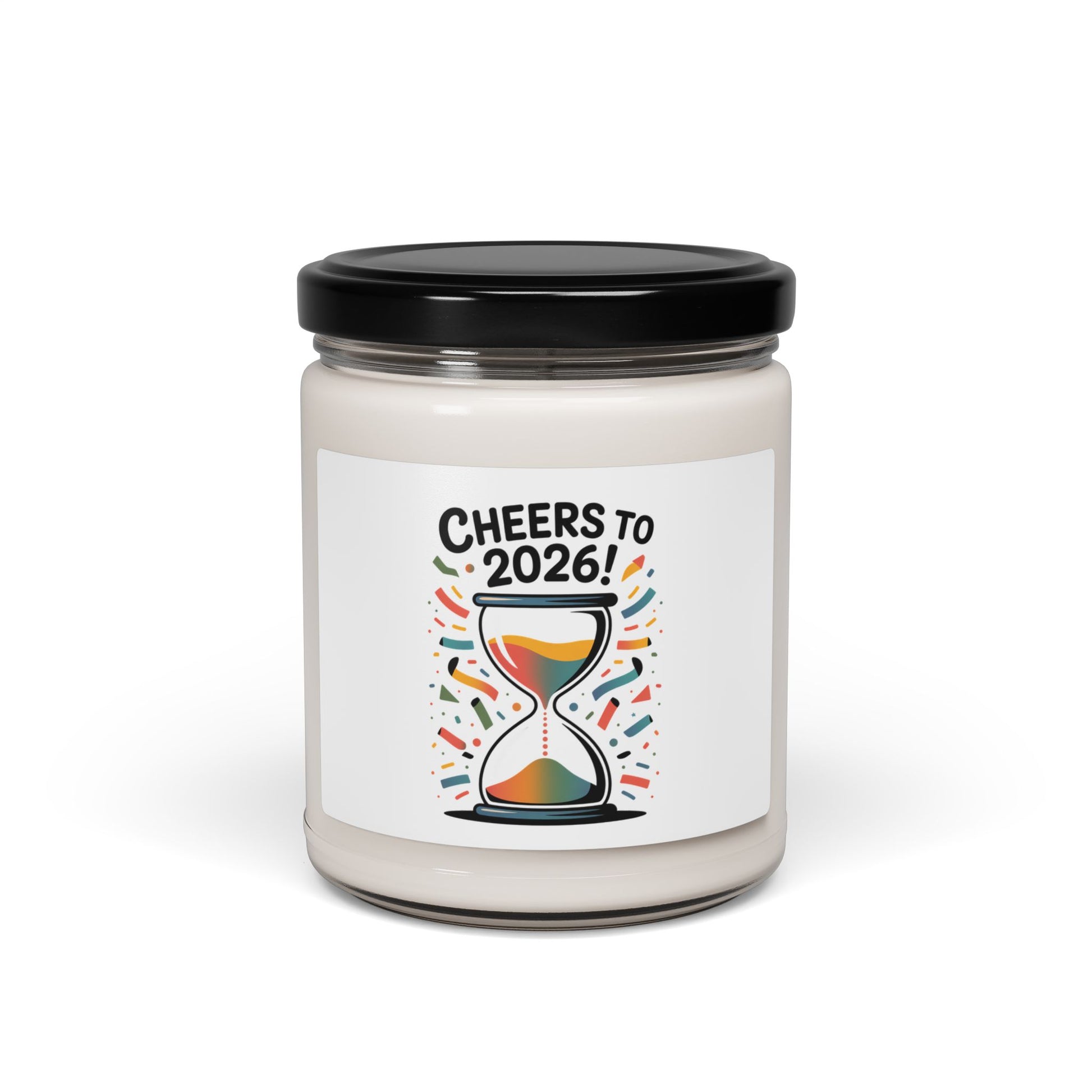 A clean, text-led soy candle that pairs wry New Year humor with restrained optimism — an illustrated hourglass and festive confetti frame a short countdown message tied to 2026 goals and manifest-luck vibes. The modern sans-serif label and simple color pops keep the look fresh and adaptable for seasonal decor, table settings, or a quiet moment of reflection as the year turns. Product features - 100% natural soy wax blend, 100% cotton wick and glass jar - Reusable glass vessel with glossy permanent adhesive label - Burning time: 50-60 hours; one size: 2.8″ × 3.5" - Choose from 12 aromatic scents (including Unscented) - Compliant with ASTM safety standards; assembled in the USA Care instructions - Keep burning candle within sight. Keep away from children and pets. Never burn the candle near flammable items.