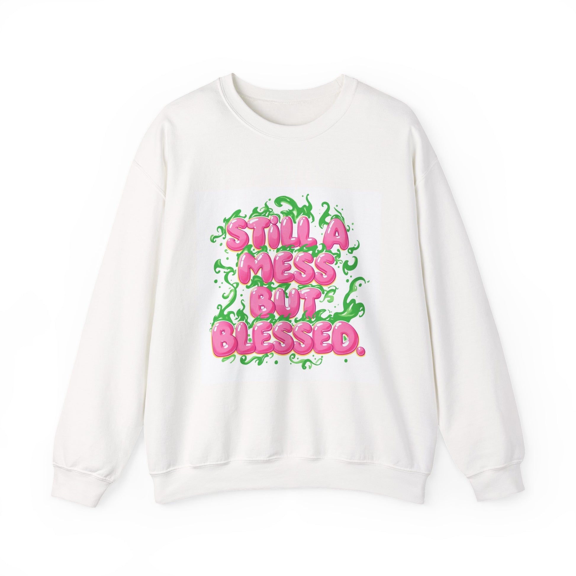 Crewneck Sweatshirt — "Still a Mess But Blessed" Pink Bubble Letter Graphic