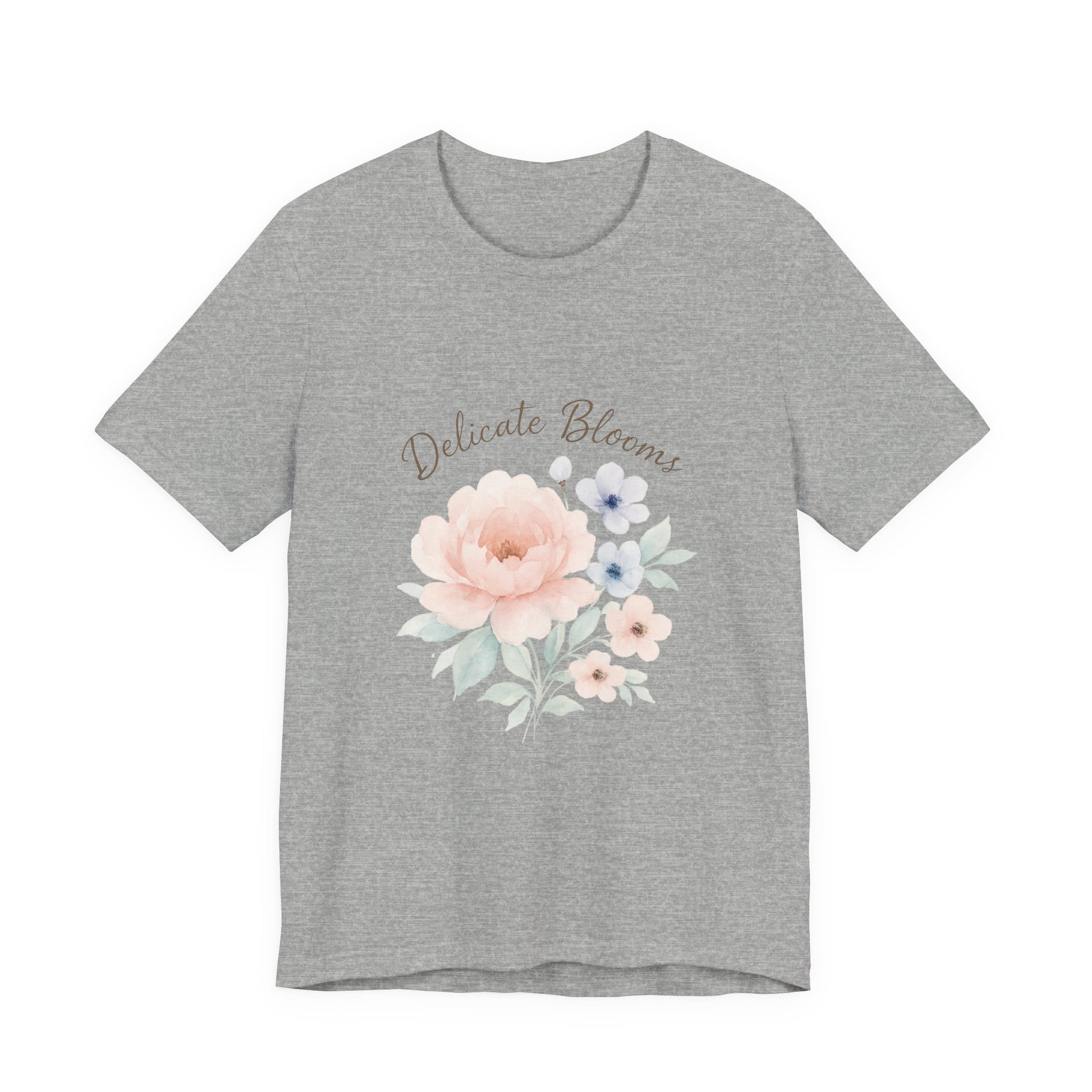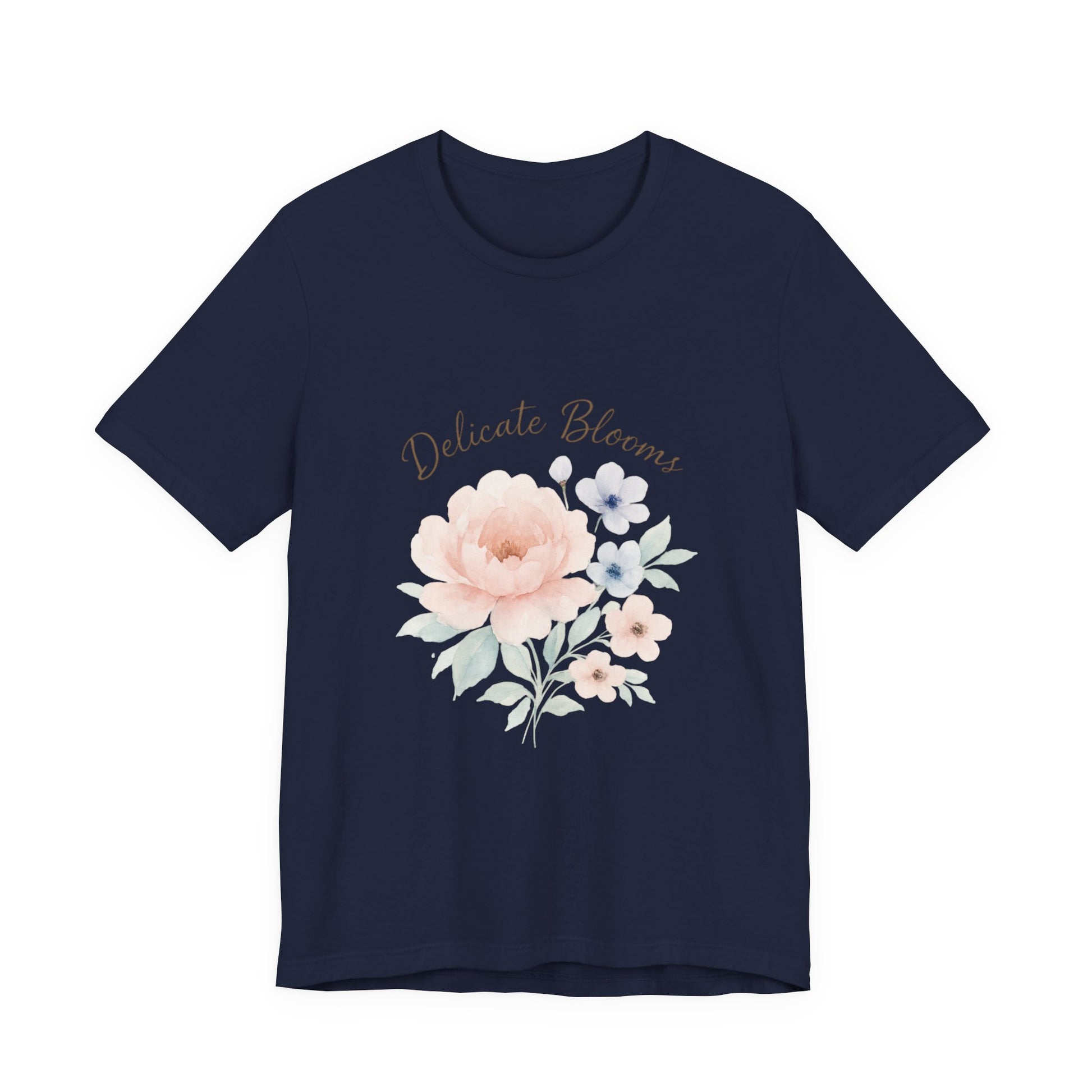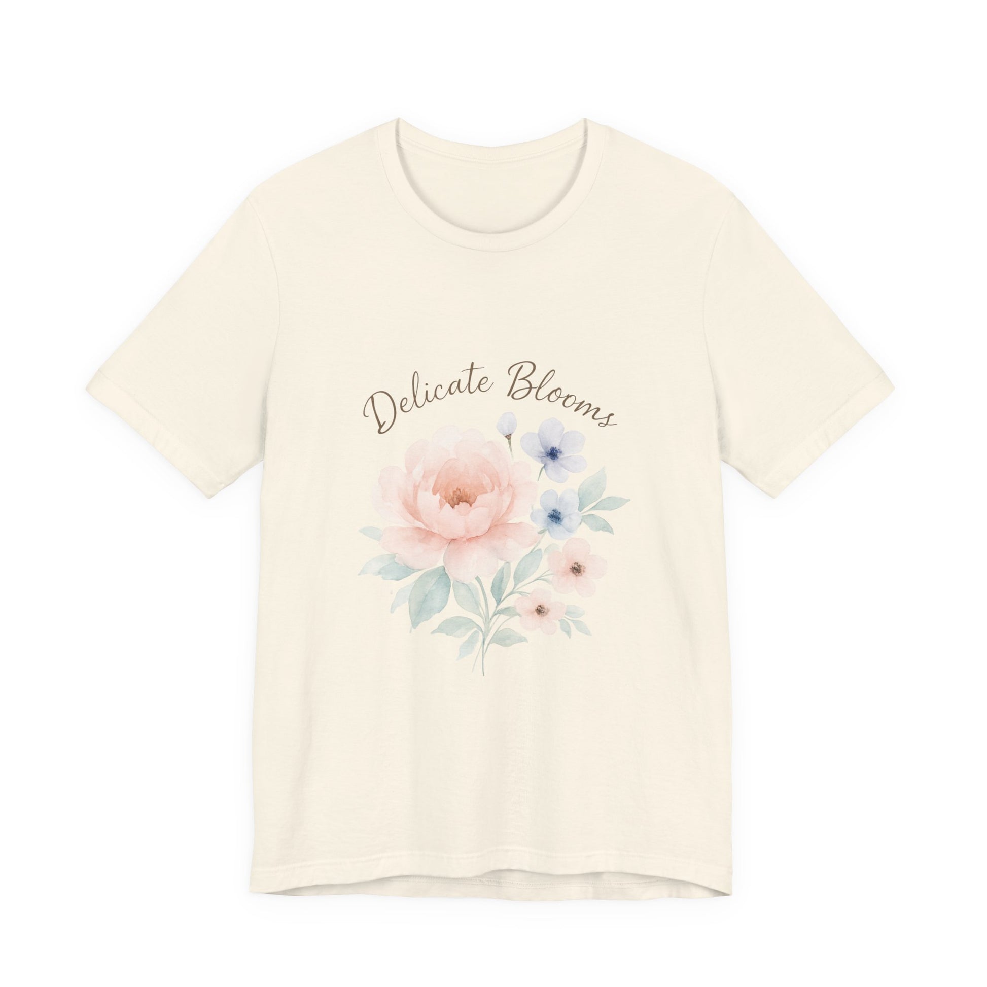 Soft, airy cotton meets a gentle, hand-painted bouquet. This lightweight tee carries a washed watercolor floral and the words “Delicate Bloom” in a soft script, evoking slow mornings in a sunlit kitchen or a quiet walk through a neighborhood garden. The retail fit and classic crew neckline keep the look neat and easy to layer under cardigans or over camisoles. Wear it with relaxed jeans or a linen skirt when you want an understated, romantic touch—subtle and personal, not loud. The breathable Airlume combed cotton feels cool against the skin, while the tear-away label and reinforced shoulder tape keep comfort and shape when you reach for another favorite. Product features - 100% Airlume combed ring-spun cotton — lightweight (4.2 oz) and breathable - Retail fit with crew neckline — neat, easy to layer and accessorize - Side seams and shoulder tape — holds shape and prevents stretching - DTF/DTG-printed sleeves and neck label for crisp, vibrant design details - Tear-away label, REACH certified materials, responsibly manufactured Care instructions - Machine wash: cold (max 30C or 90F) - Non-chlorine: bleach as needed - Tumble dry: low heat - Iron, steam or dry: medium heat - Do not dryclean