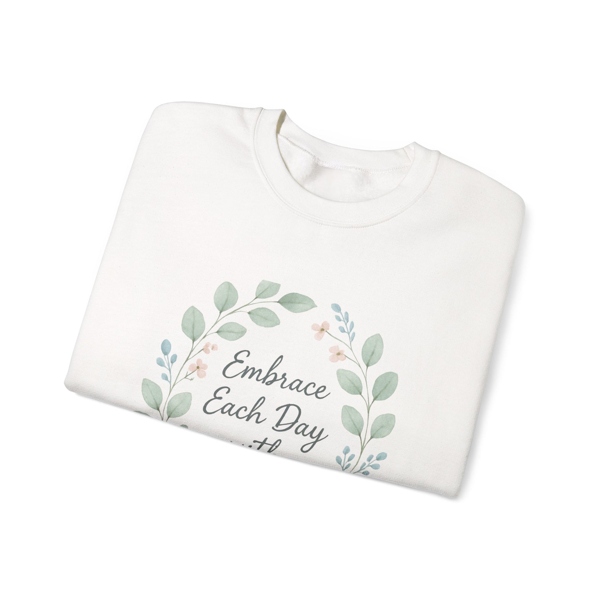 Soft, simple, and quietly uplifting — this crewneck wraps you in gentle comfort while carrying a small reminder to move through the day with care. The relaxed cut and midweight cotton-poly blend feel familiar the moment you pull it on. A delicate watercolor wreath frames the phrase “Embrace Each Day with Kindness,” giving the sweatshirt a calm, garden-like charm that settles into everyday life: morning coffee on the porch, slow walks with friends, or cozy evenings with a book. It’s designed for someone who values warmth, quiet encouragement, and pieces that speak softly rather than shout. Subtle enough to layer, sweet enough to wear on its own, this sweatshirt becomes part of your routine — the kind of garment that comforts and quietly inspires.