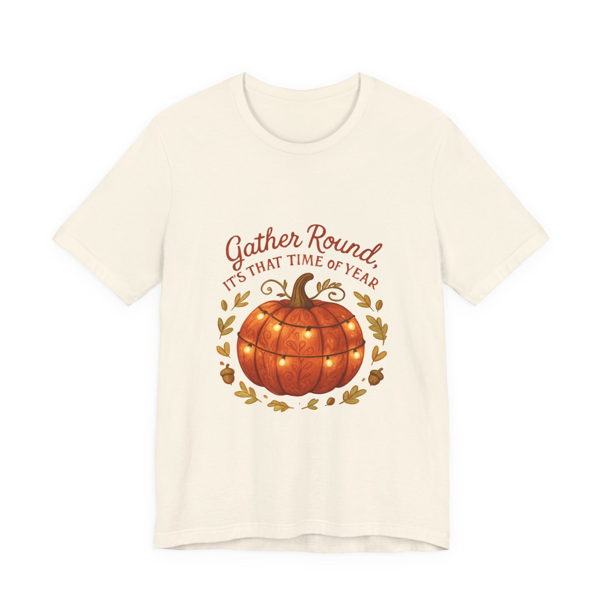 Gather Round Pumpkin Tee — "Gather Round It's That Time of Year" Fall Thanksgiving T-Shirt