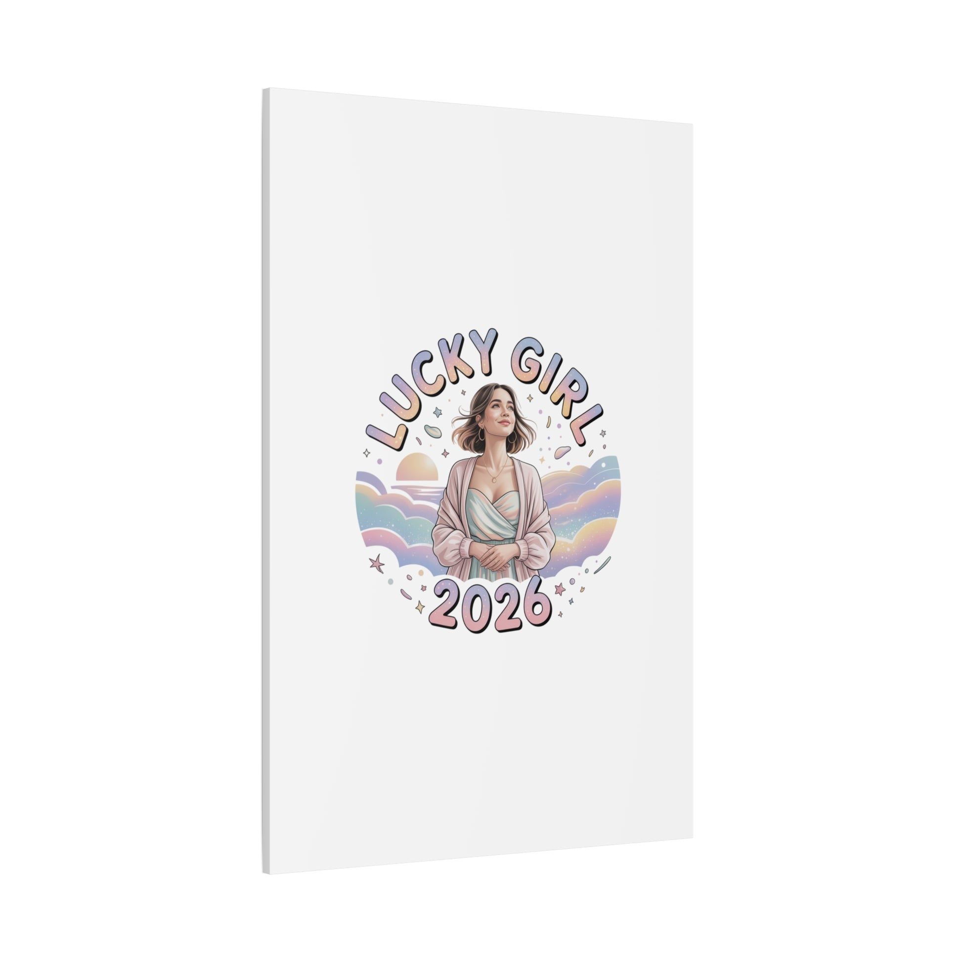 Soft pastel manifesto canvas celebrating optimistic 'Lucky Girl 2026' vibes with a whimsical, feminine illustration. The artwork features a serene young woman framed by iridescent clouds, tiny luck symbols, and playful rounded lettering that echoes the manifest-luck trend’s sparkly, hopeful energy. Sized and finished for wall display, it brings a gentle, celebratory mood to bedside walls, reading nooks, or a manifestation corner. Product features - 2 rubber dots on bottom to keep canvas in place when hung - Unique JONDO coating with UL-certified Greenguard Gold inks - Canvas stretched on radial pine from FSC certified renewable forests - Printed using non-hazardous, non-toxic, non-flammable latex inks - Materials: cotton/polyester canvas with pine wood frame Care instructions - If the canvas does gather any dust, you may wipe it off gently with a clean, damp cloth.