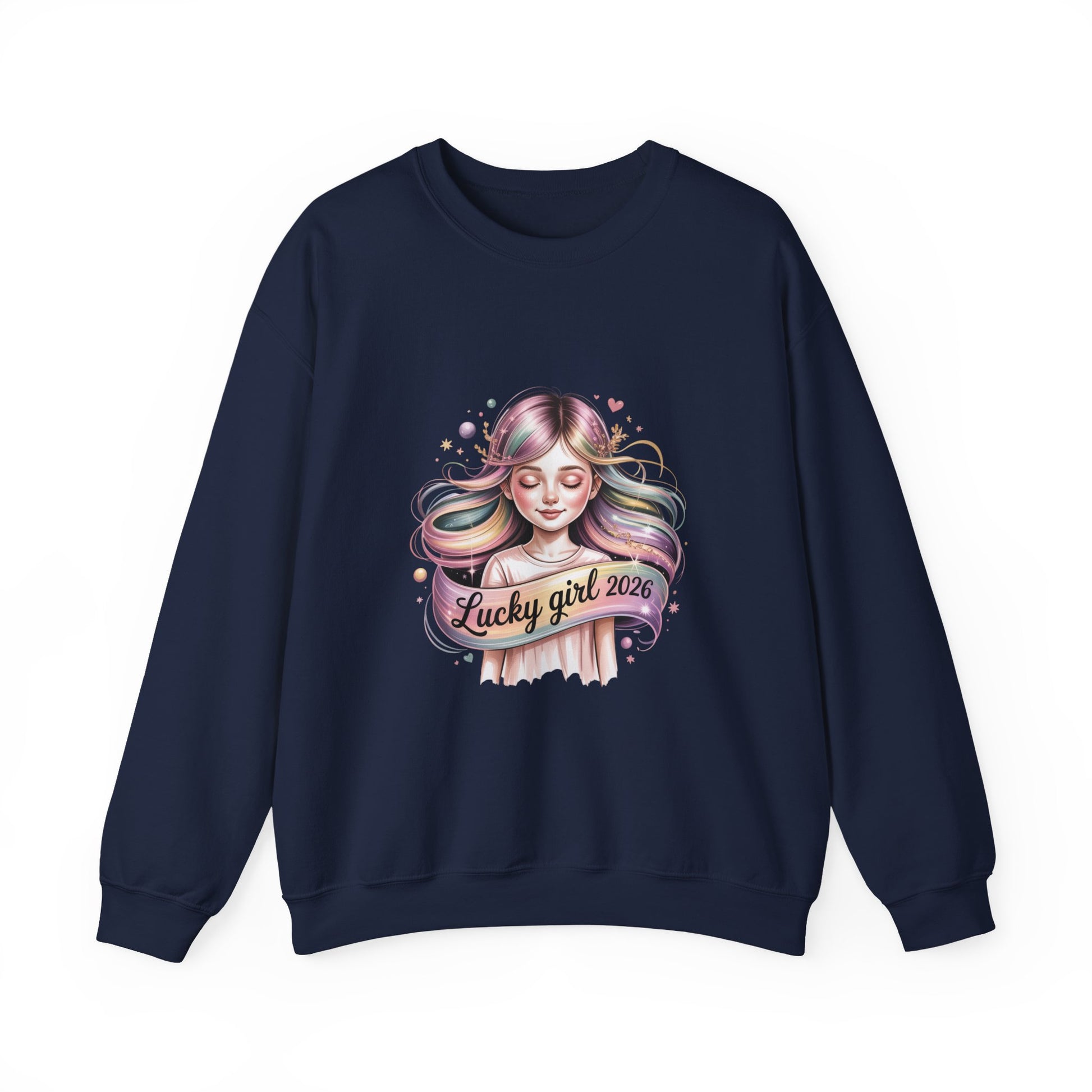 Soft, pastel affirmation sweatshirt featuring a dreamy, feminine portrait framed by subtle sparkles and a flowing ribbon-style mantra that reads “Lucky girl 2026.” The artwork blends glowy watercolor tones and metallic-accent vibes to match the Lucky Girl 2026 manifest-luck trend, offering a cozy wardrobe piece that feels like wearing a charm or gentle reminder to invite optimistic energy into the new year.