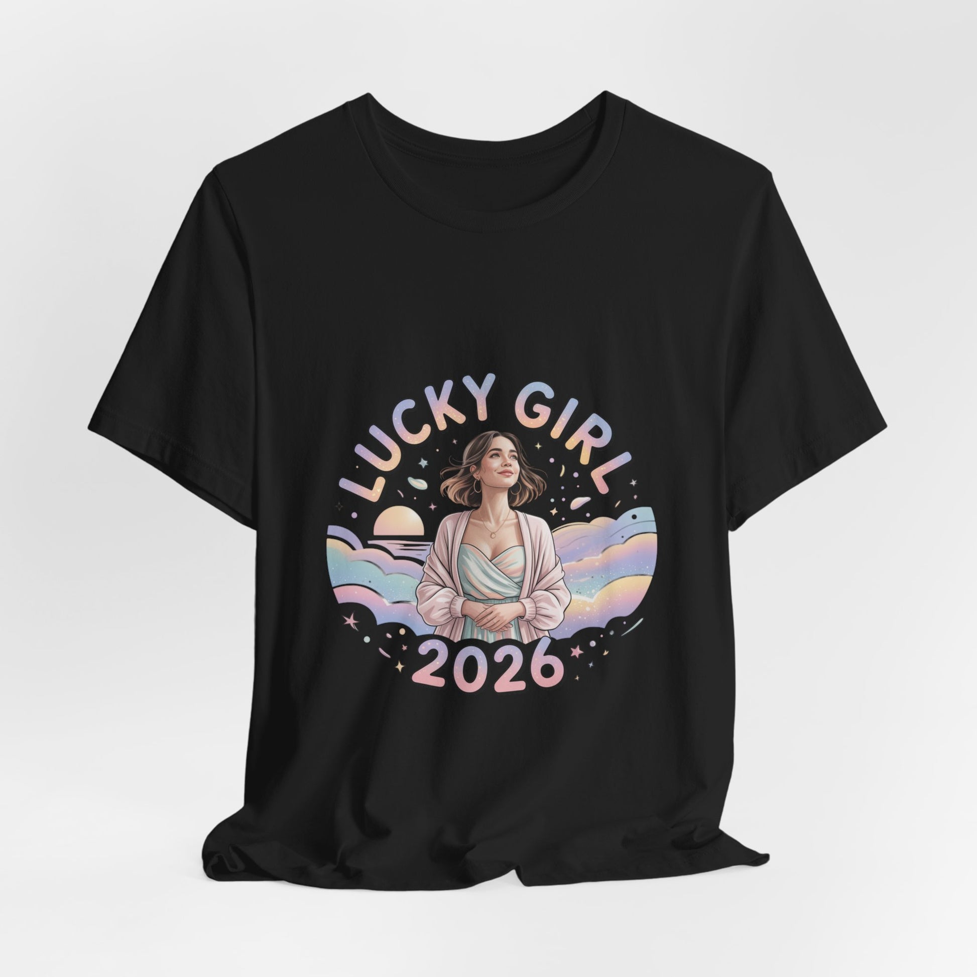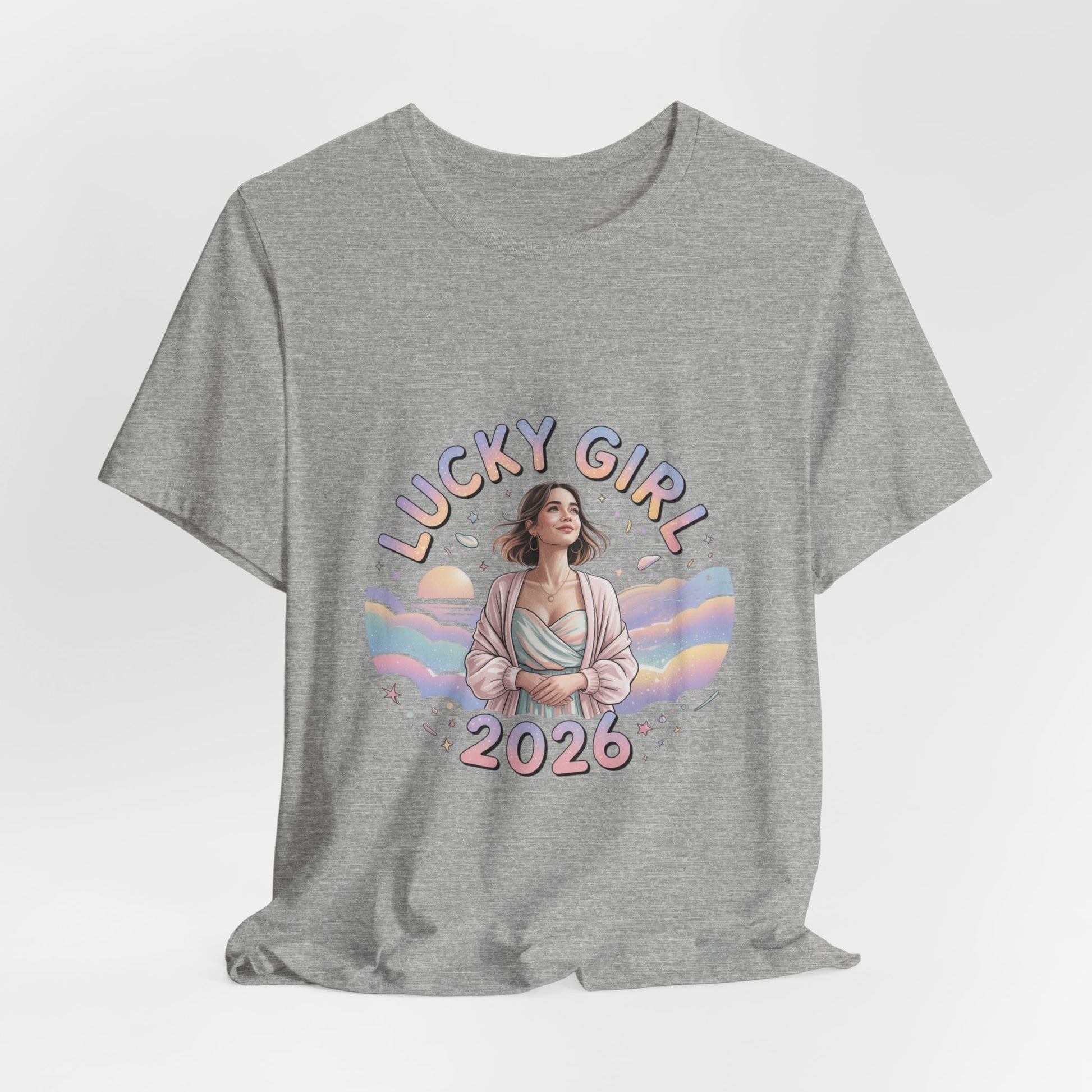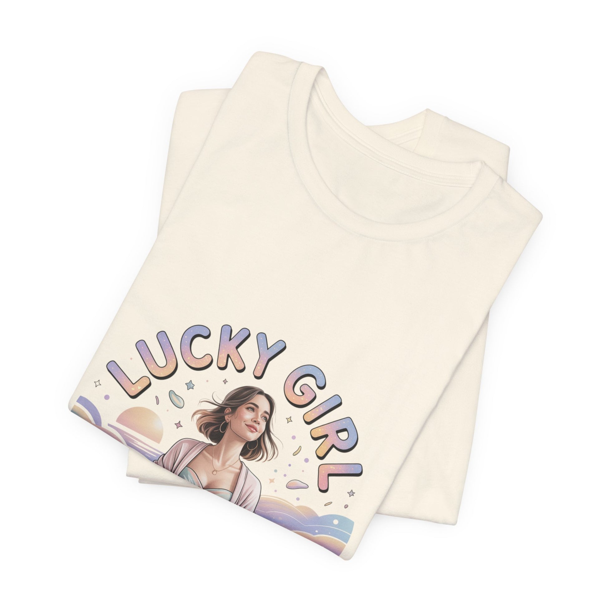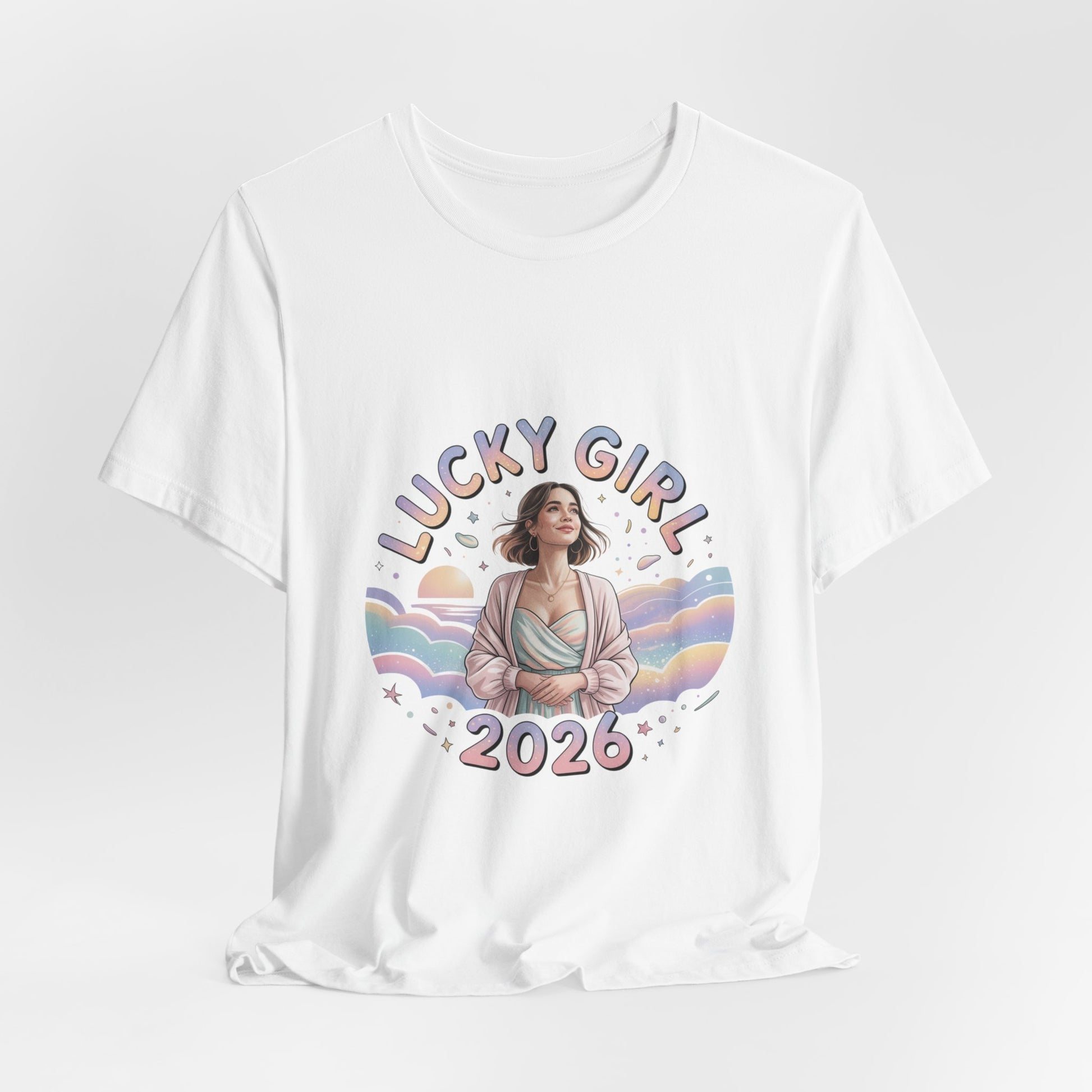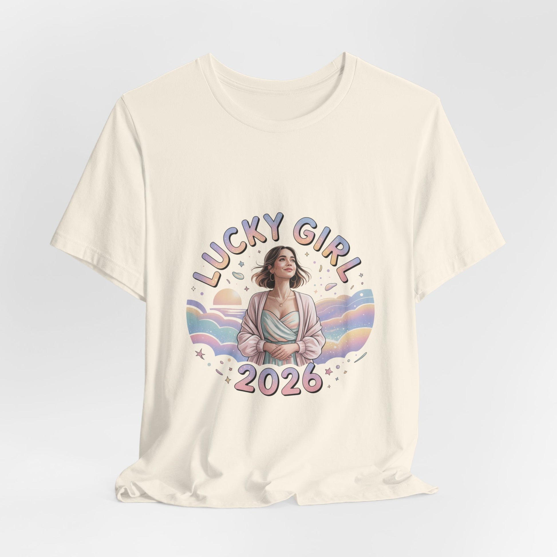 Soft pastel illustration centered on a lightweight unisex tee: a serene, feminine figure framed by rainbow waves, tiny star and sparkle motifs, and rounded, playful lettering that reads like a wearable charm. The design leans into the Lucky Girl 2026 trend with glowy, whimsical tones and subtle metallic-look accents implied by the artwork—an optimistic, manifest-luck vibe that reads as a gentle mantra rather than a slogan. Product features - 100% Airlume combed & ring-spun cotton (Bella+Canvas 3001), 4.2 oz/yd² - Retail fit with crew neckline and side seams for shape retention - Ribbed knit collar and shoulder tape to prevent stretching - Sleeve and neck label prints produced via DTF/DTG printing methods - Age: adults; REACH certified; sourced from Honduras Care instructions - Machine wash: cold (max 30C or 90F) - Non-chlorine: bleach as needed - Tumble dry: low heat - Iron, steam or dry: medium heat - Do not dryclean